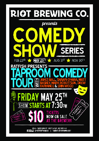 Comedy Night: James Ball, Shawn O'Hara, Matt Baskey, Mark Robertson, Drew Farrance, Erin Wood @ Riot Brewing Co. May 25 2018 - Jan 11th @ Riot Brewing Co.