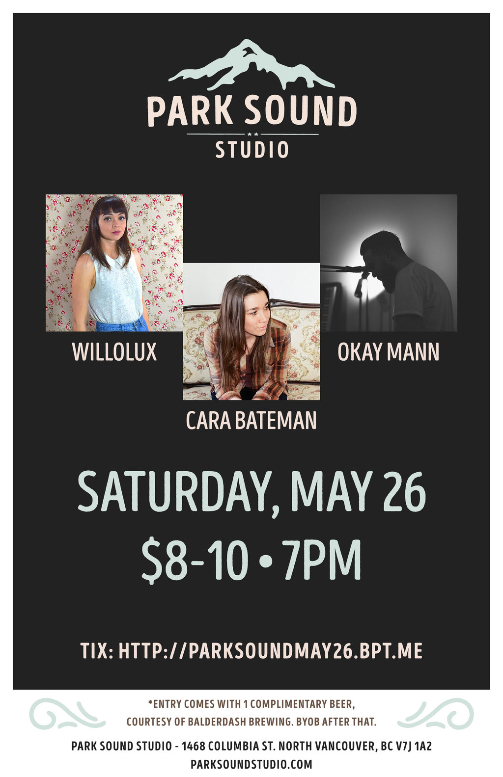 Park Sound Presents is a monthly musical showcase hosted at Park Sound Studio, a recording studio located in North Vancouver. On Saturday, May 26th we're welcoming Willolux, Cara Bateman & Okay Mann.