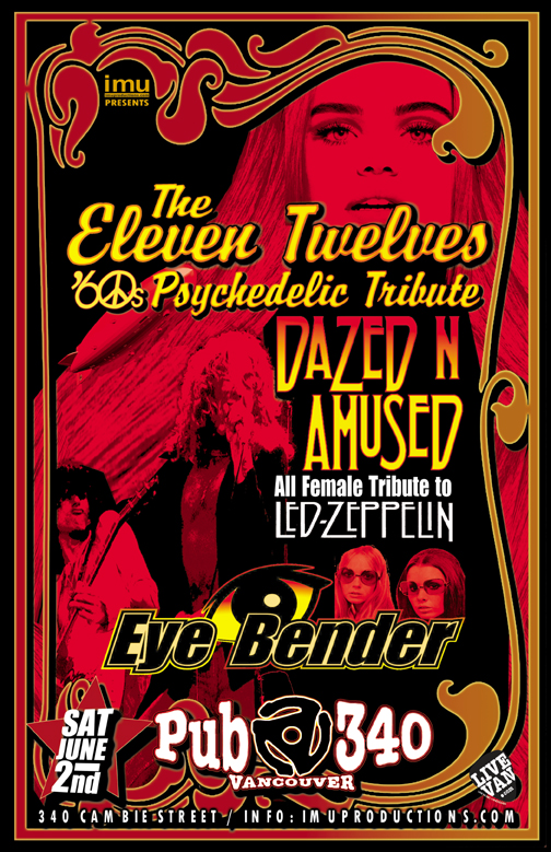 . Saturday, June 2nd IMU presents The ELEVEN TWELVES '60s psych garage rock tribute, DAZED 'N AMUSED Led Zeppelin Tribute & EYE BENDER @ Pub 340, 340 Cambie Street. Doors 8pm / Show 9pm / $10 cover