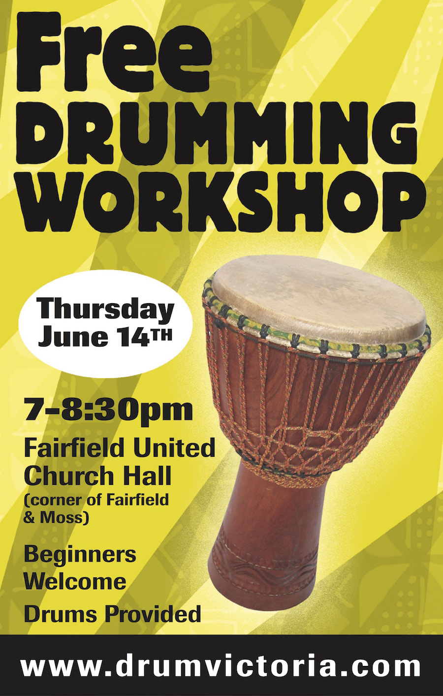 The free drumming workshop is one of the most popular music events in Victoria. Drums are provided for everyone, but if you do have your own a drum, you are invited to bring it along.