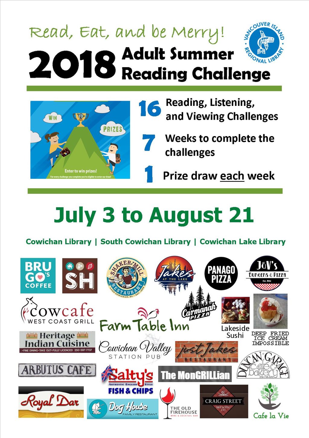 Try our annual summer program for adults and fill up on books, movies, and more! Challenge yourself with new formats, new topics, new titles. For each of the 16 tasks you complete, come in to get your booklet stamped and receive a draw slip for a chance to win a prize, including treats from local businesses.