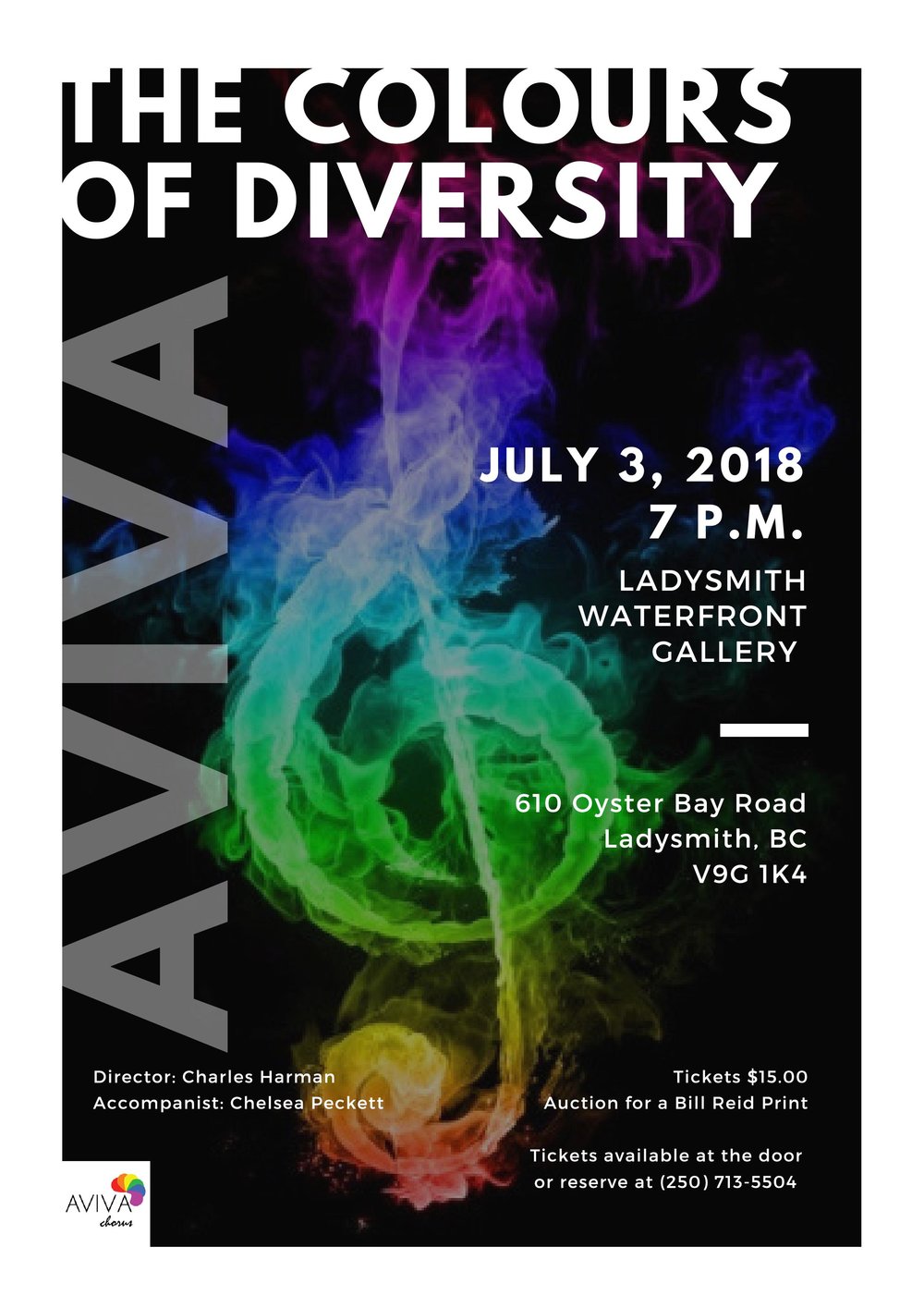 AVIVA chorus performs our Colours of Diversity concert with the auctioning of a Bill Reid print fundraiser. Tickets $15 at the door or call (250) 713-5504 to reserve.