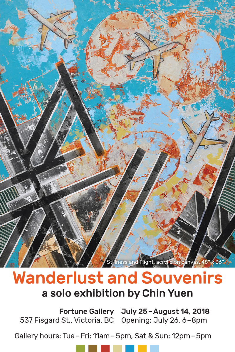 "Wanderlust and Souvenirs" is a solo exhibition by Chin Yuen. It was just a matter of time that Yuen's migratory past and constant travels organically influence her creativity. In her upcoming solo exhibition at Fortune Gallery, Yuen's paintings feature exciting photos and fabrics acquired from her travels. These richly textured paintings are unique mementos and natural testaments of an artist with a penchant for wanderlust.
