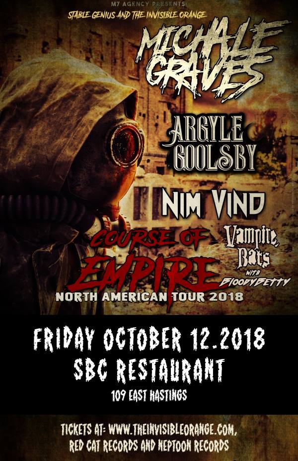 Supporting Michale on this World Tour will be horror punk standout Argyle Goolsby and the Roving Midnight, Canada’s own Nim Vind, and Vancouver's Vampire Bats (with Bloody Betty)!