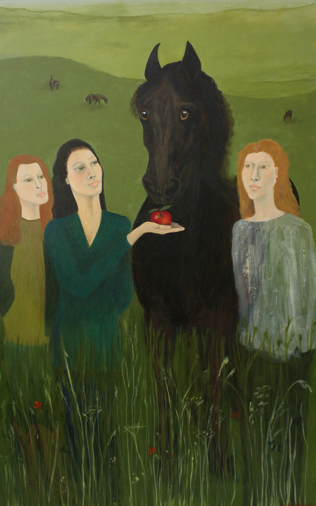 My locations are reminiscent of the East coast or Quebec. All of the work derives from my imagination and has a sophisticated/primitive style. I draw no line between reality and imagination and pay no heed to the laws of physics. My children can fly, birds can carry passengers and whales float effortlessly in the sky.