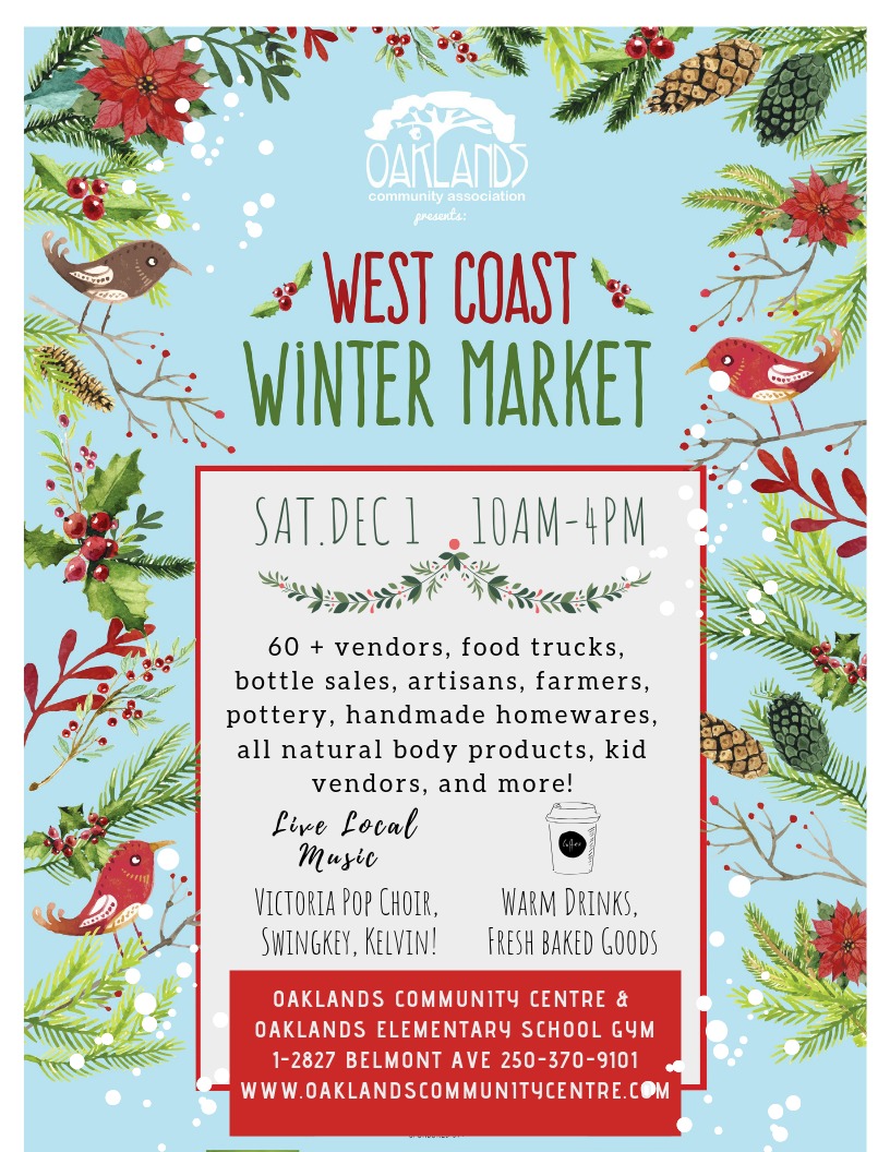 The Oaklands West Coast Winter Market returns for one day only on Saturday, December 1st from 10:00am to 4:00pm. There will be live music, an Oaklands Community Association concession stand selling warm drinks and goodies, Food Trucks, artisans, farmers, kid vendors, and more!