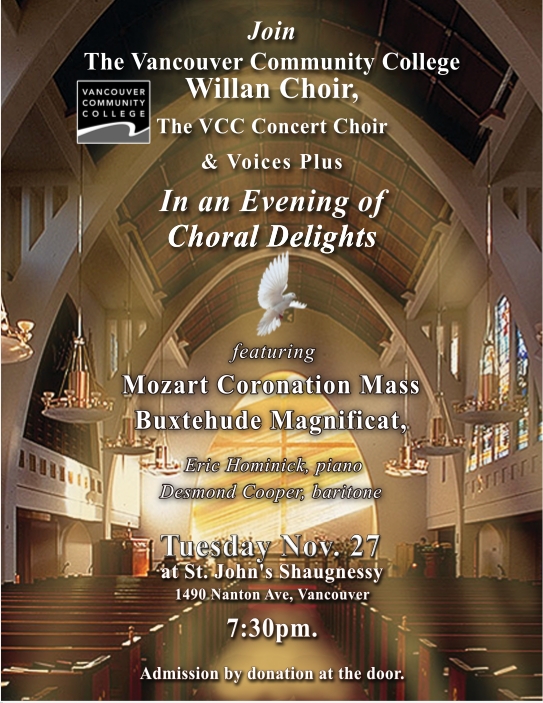 Choral performances of Mozart Coronation Mass, Buxtehude Magnificat and more, led by choral conductor Patricia Plumley, featuring pianist Eric Hominick and baritone soloist Desmond Cooper.