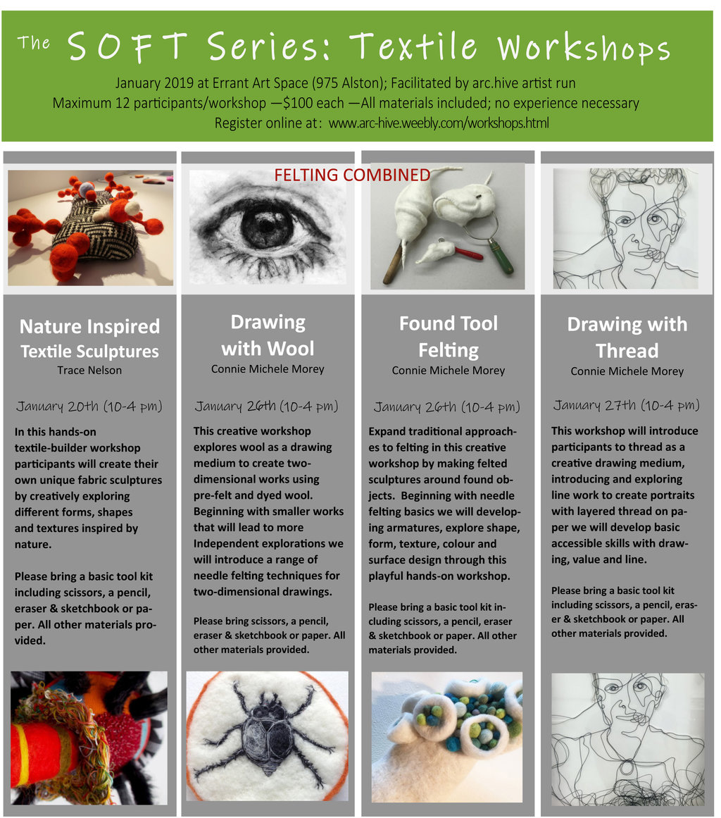 The Soft Series: Textile Workshops: Trace Nelson, Connie Michele Morey @ arc.hive artist run centre Jan 20 2019 - Feb 2nd @ arc.hive artist run centre