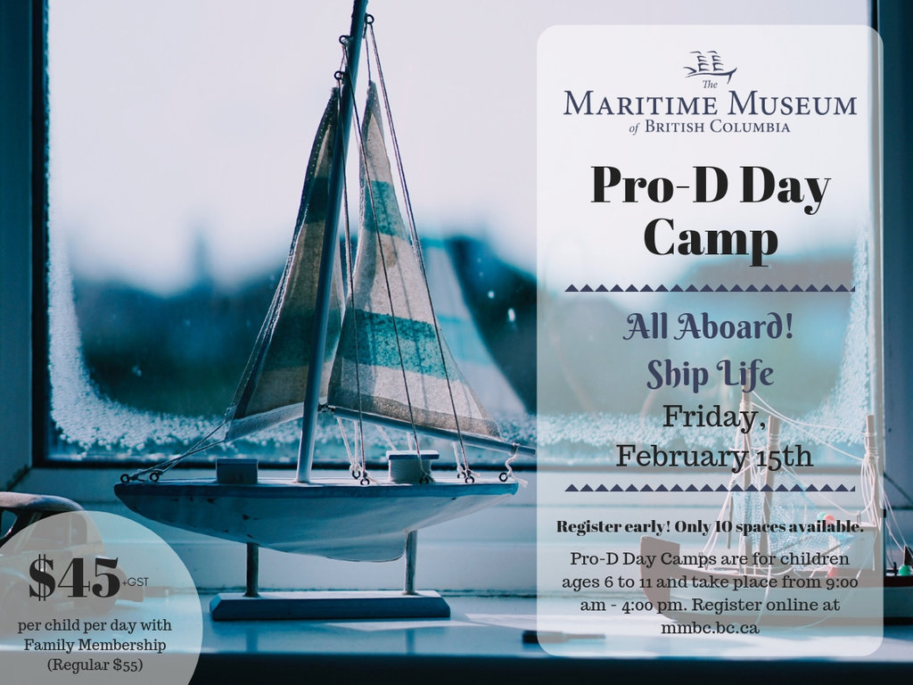 Come and spend the day off school at the Maritime Museum of BC learning all about life on board a ship! Join in while we learn about shipbuilding, navigating using a compass, and do some ship-themed art. Our Pro-D Day Camp runs from 9:00 am to 4:00 pm on Friday, February 15th and is for children ages 6-11. Space is limited to 10 children, so register early!