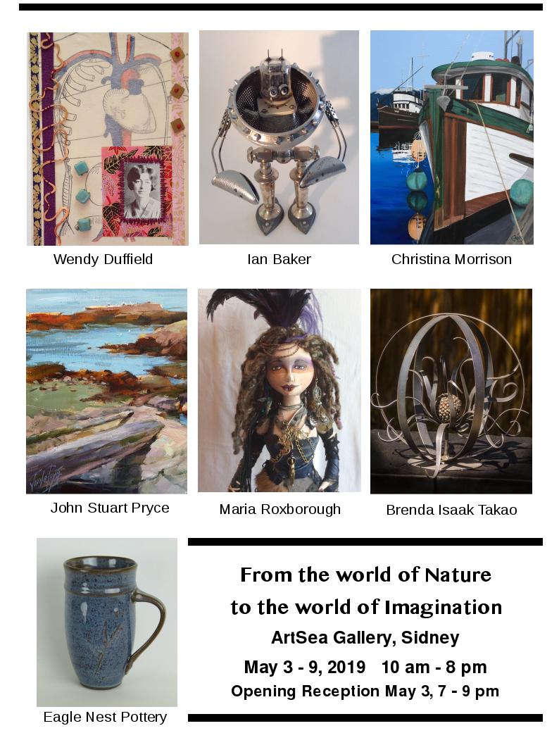 Exhibiting are: Wendy Duffield, Mixed media; Ian Baker, Mixed media sculpture; Maria Roxborough, Soft sculpture; Brenda Isaak Takao, Multimedia; Christina Morrison, Marine Painting; John Stuart Price, Landscapes; Eagle Nest Pottery.