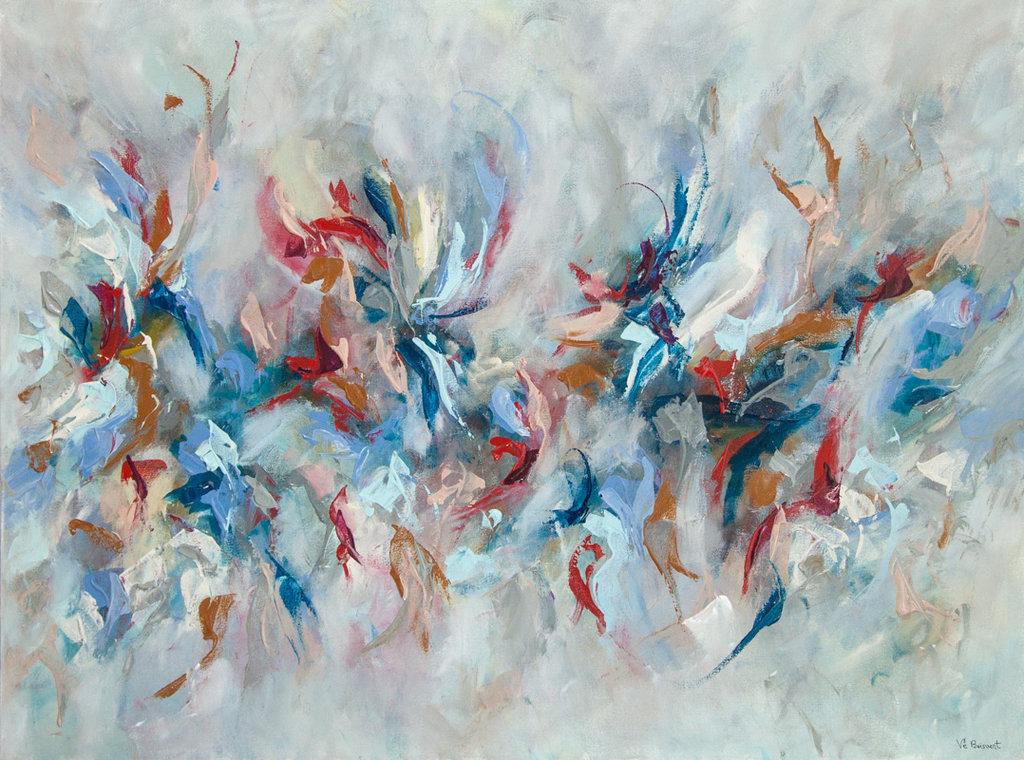 Inspired by shapes and elements from nature, Vé Boisvert’s creative approach to paintings consists of making the imagination perceivable. Using her intuition and superimposing colours on top of each other, Vé creates paintings bursting with positive energy. While painting, she listens to music and allows the rhythm of the song to be her guide as it represents the language of emotion within her. She tends to listen to low frequency music, favouring the nostalgia and melancholy it draws out of her. By harnessing and utilizing these profound emotions Vé is able to translate her feeling to paint on canvas which then evolves into beautiful and inspiring paintings.
