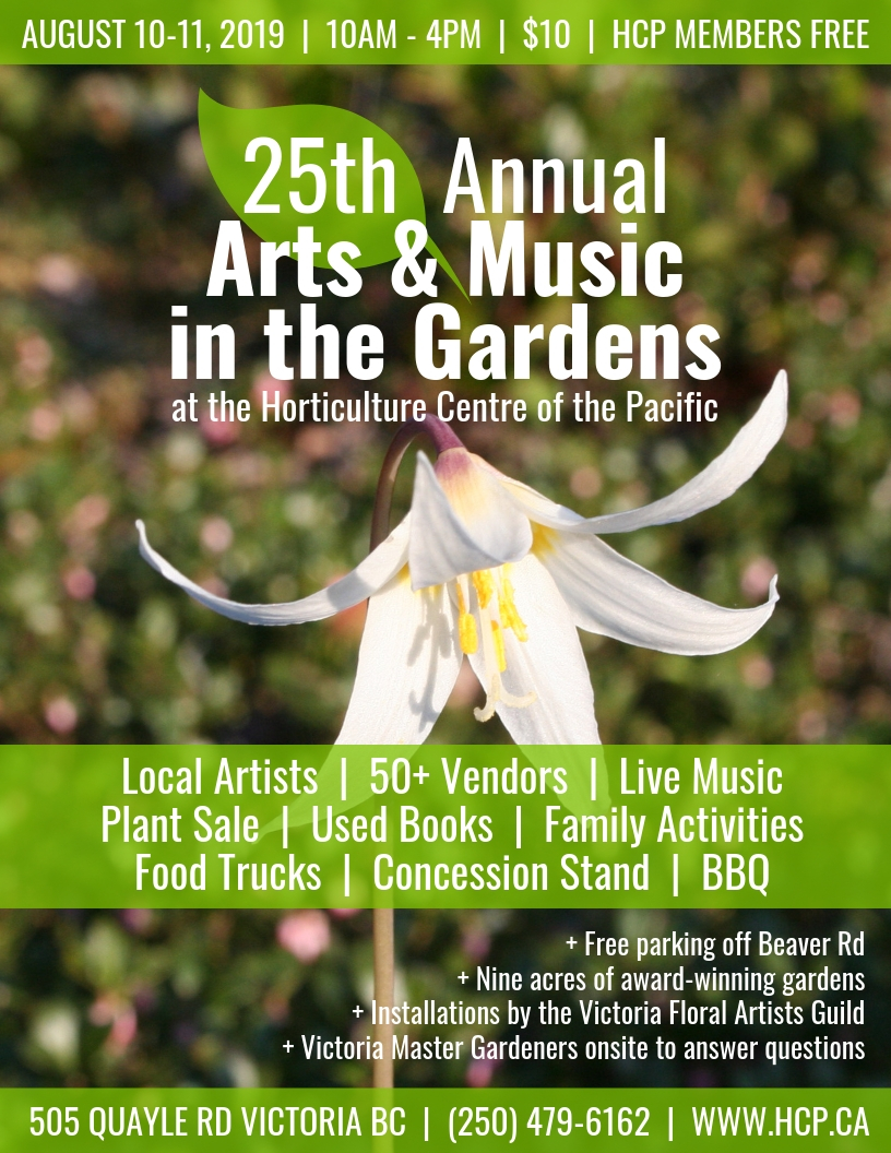 The Gardens at HCP is excited to host the 25th Annual Arts & Music in the Gardens, this August 10th and 11th, 2019. This incredible weekend showcases 3 stages of live music and over 50 local artists, vendors, and exhibitors, all nestled in 9 acres of award-winning gardens. The full event program will be available August 1st at www.hcp.ca/artsandmusic.