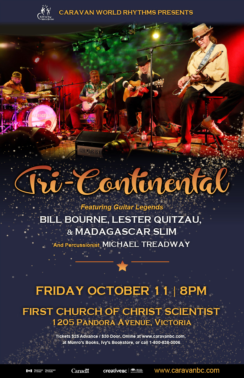 Tricontinental Blues Guitar Trio: Bill Bourne, Lester Quitzau, Madagascar Slim @ First Church of Christ, Scientist Oct 11 2019 - Jan 12th @ First Church of Christ, Scientist