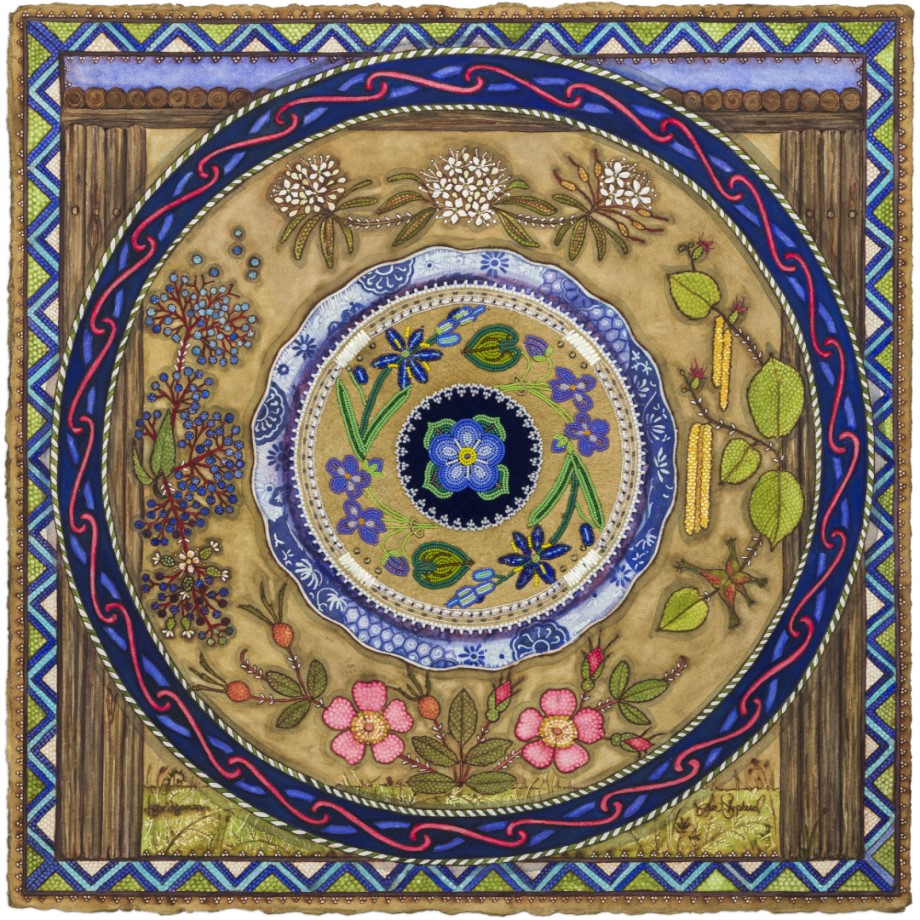Lisa Shepherd and Kristi Bridgeman were already well established in their respective art careers when they discovered by chance that they were related through a common relative, Suzette (Chalifoux) Swift, a revered Métis bead artist. That discovery sparked a rich collaboration of Shepherd’s beadwork and Bridgman’s painting incorporated into a series of 30” square shadow box pieces, each with its own inspired story.