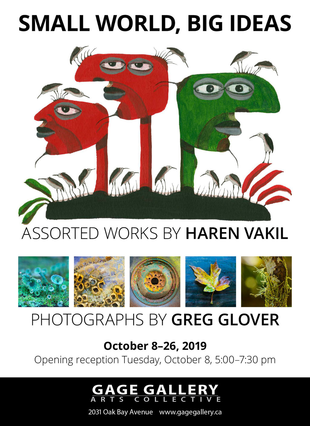 Gage Gallery member Haren Vakil and his invited guest Greg Glover have a lot in common. They met at meetings of the Island Illustrators Society and shared their views on art, politics and the nature of reality. In 2015 they collaborated on an artwork for In Cahoots (Synergy) art show at the Slide Room Gallery. In Wayfarers, Glovers photography and computer graphics added another dimension to Vakil’s boating story. Both men share an upbeat curiosity about the minutiae of existence, and the creative energy to express myriad ideas.