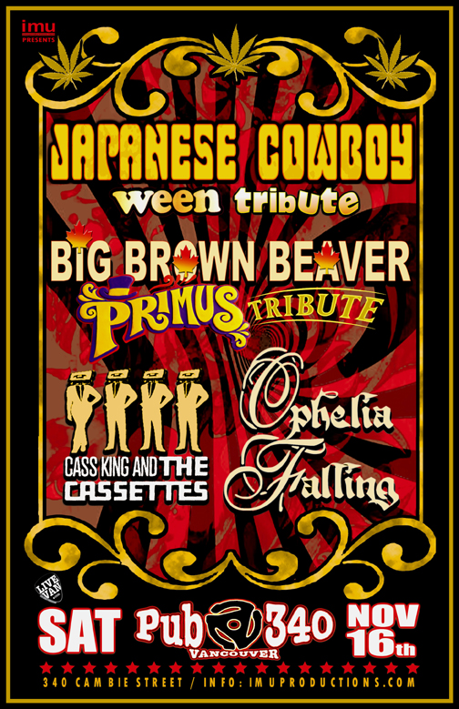 . Saturday, November 16th IMU presents JAPANESE COWBOY Ween Tribute, BIG BROWN BEAVER Primus Tribute w/ OPHELIA FALLING + CASS KING & THE CASSETTES @ Pub 340, 340 Cambie Street. Doors 8pm / Show 9:30pm / $10 cover