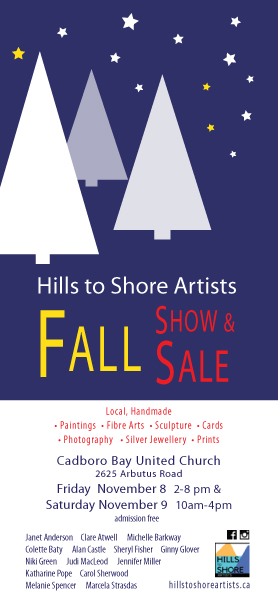 The Hills to Shore Artists are delighted to invite you to their first Fall Show and Sale on Nov 8&9 at the Cadboro Bay United Church. For the first time they will all gather under one roof so you can in just one stop enjoy paintings, photography, jewelry, fabric art, sculptures and more. This is the perfect opportunity to find something special for yourself or your loved ones!