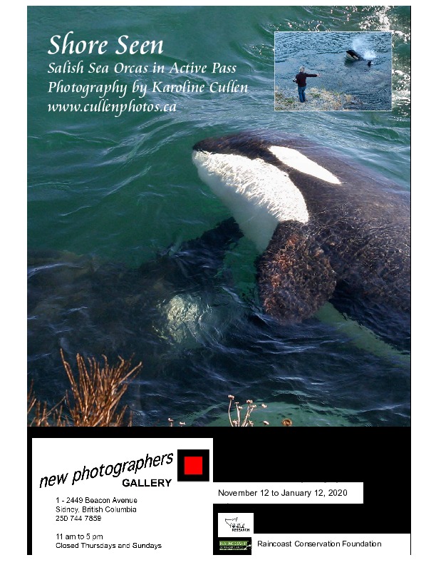 Karoline's "Shore Seen" features remarkable images of Orca families close to shore in Active Pass off Galiano Island.