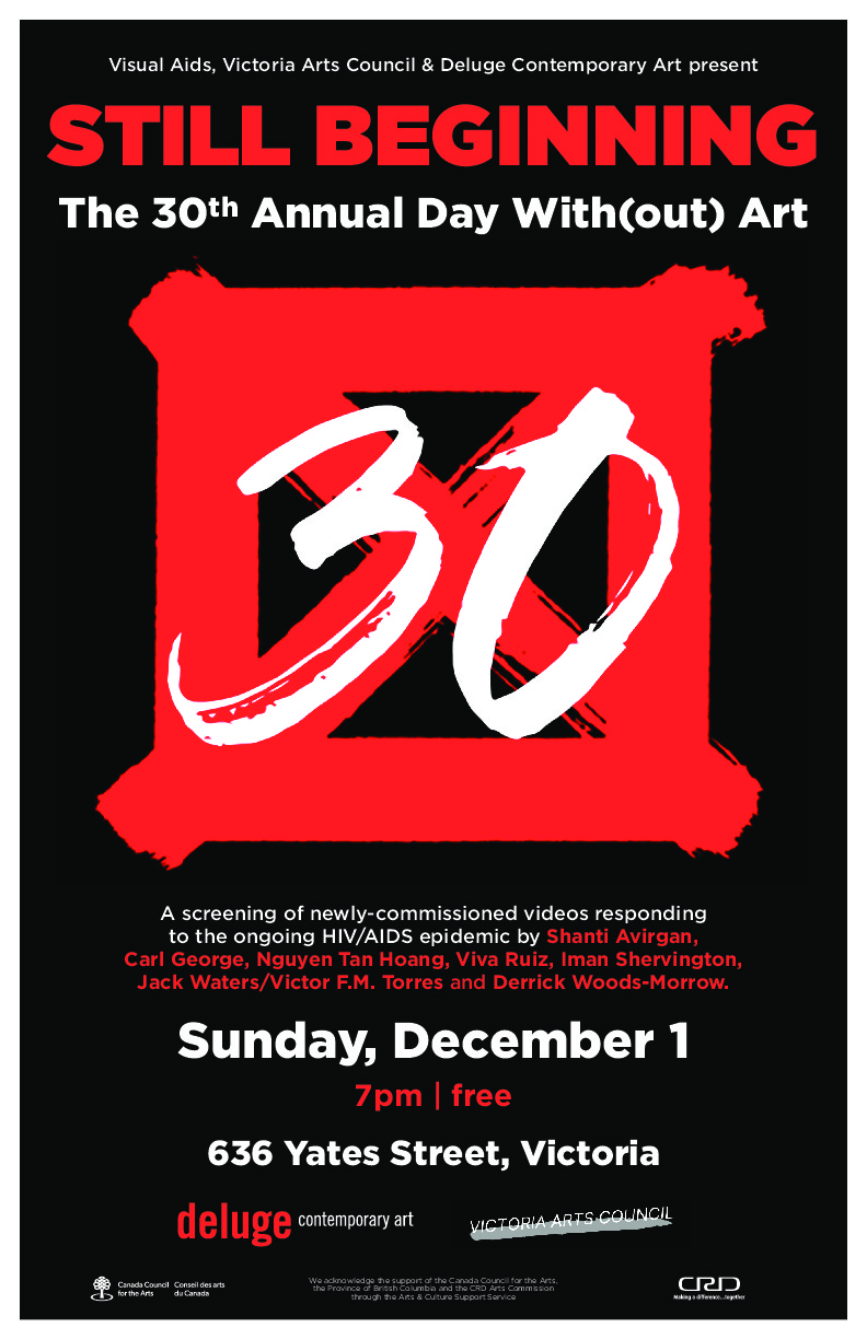 Deluge Contemporary Art and the Victoria Arts Council are proud to partner with Visual AIDS for the thirtieth annual Day With(out) Art by presenting STILL BEGINNING, a program of seven newly commissioned videos responding to the ongoing HIV/AIDS epidemic by Shanti Avirgan, Nguyen Tan Hoang, Carl George, Viva Ruiz, Iman Shervington, Jack Waters/Victor F.M. Torres and Derrick Woods-Morrow.