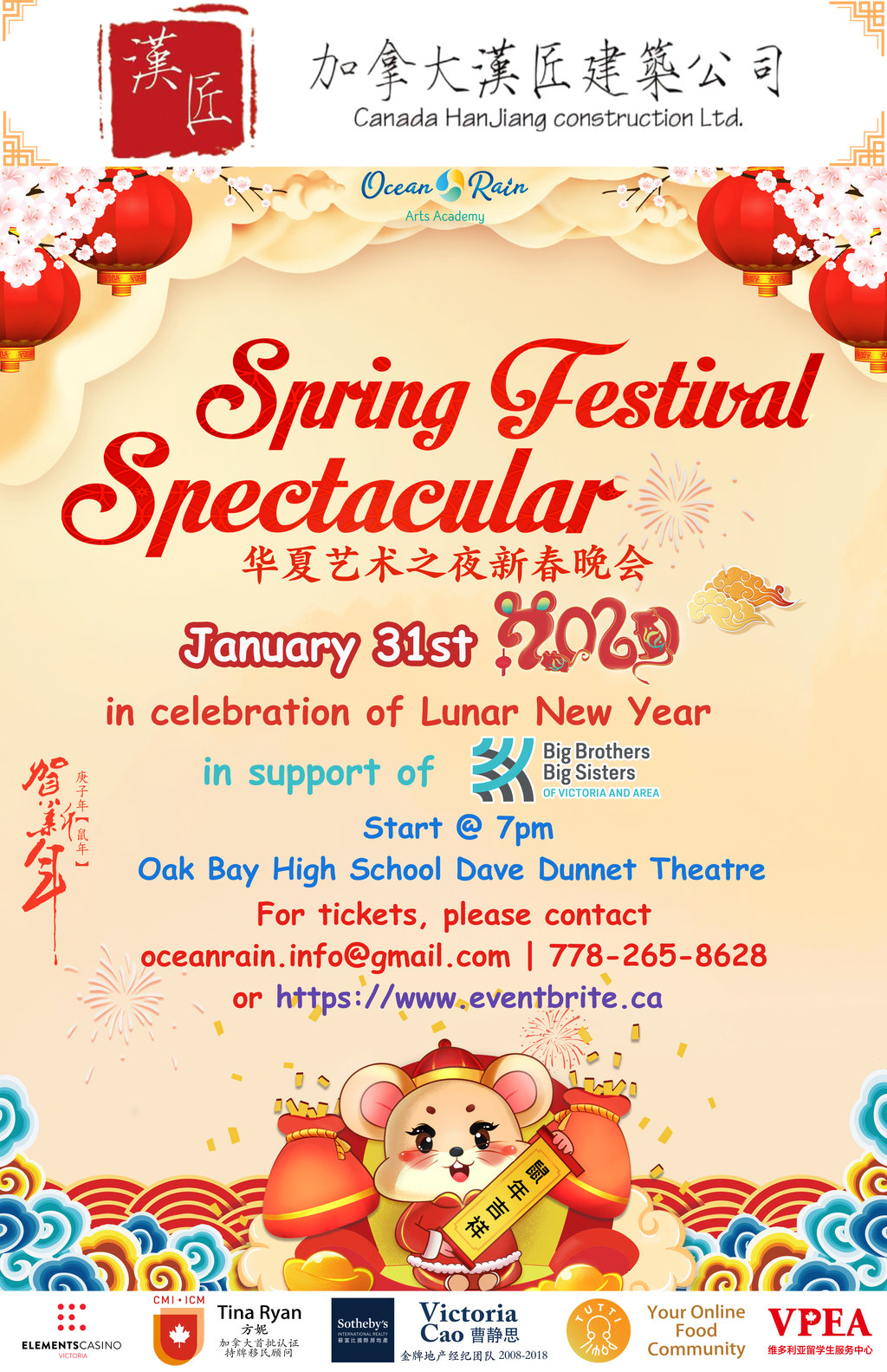 Spring Festival is also known as Lunar New Year. To celebrate this cultural tradition, Ocean Rain Arts Academy presents the 3rd Spring Festival Spectacular with a collection of local elite talents, including the famous Ballet Etoile Canada, Ocean Rain Arts Academy, Magicians, as well as local artists from Philippine, Japanese and Korean communities. We bring you and your family 2 hours of musical performances to enjoy the magical moments of Spring Festival.