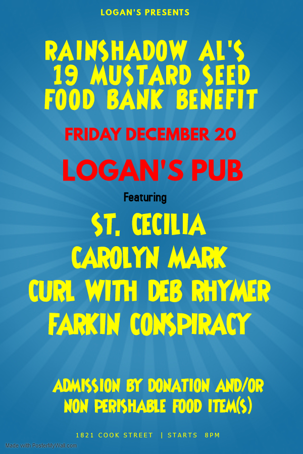 Rainshadow Al's 19th Annual Mustard Seed Food Bank Benefit: Carolyn Mark, Curl with Deb Rhymer, St. Cecilia, Farkin Conspiracy @ Logan's Pub Dec 20 2019 - Jan 11th @ Logan's Pub