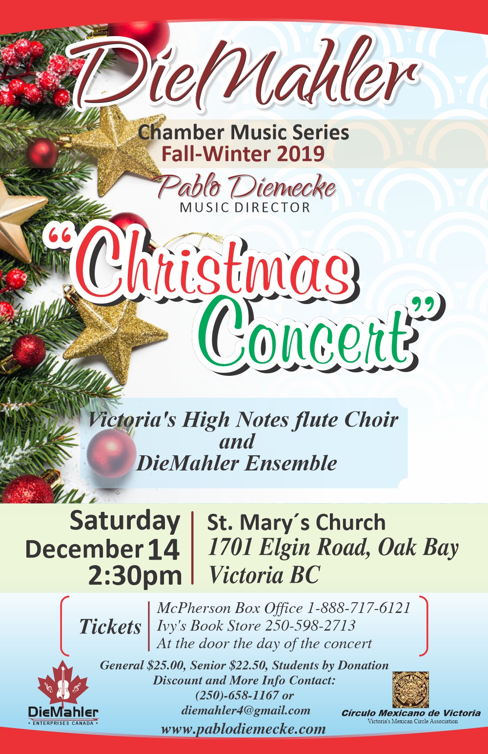 The Victoria’s High Notes Flute Choir and the DieMahler Ensemble, will be performing Christmas Carols from around the World including local composer Charles Dool's Arrangements, Nutcracker’s Selections and more!