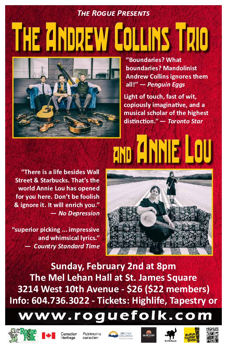 Andrew Collins is at the epicentre of Canada’s burgeoning acoustic/roots music scene. He has been a strong contributor, having co-founded seriously noteworthy Canadian bands like the Creaking Tree String Quartet, the Foggy Hogtown Boys and, more recently, his namesake Trio. That’s not to mention the fact that this prolific, robust performer – comfortable on mandolin, fiddle, guitar, mandola and mandocello – composes, produces, arranges, writes and teaches across multiple genres.