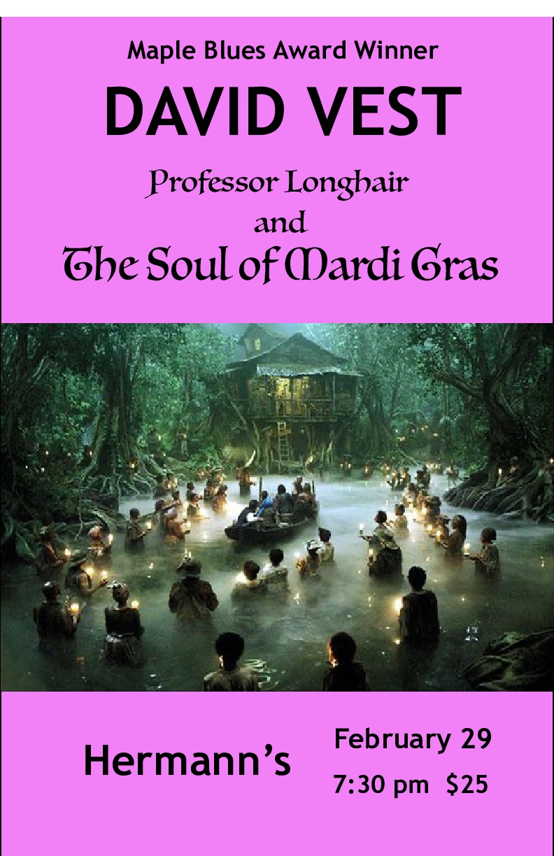 David Vest has played Mardi Gras celebrations from Florida to Galveston, because Fat Tuesday is celebrated all up and down the Gulf Coast, far beyond New Orleans. In fact, the first “Carnival” was celebrated in Mobile, in what is now Alabama, and Canadians deserve a lot of the credit for it. Come groove to classic Mardi Gras beats by David and his band, with a spotlight on Professor Longhair, the Bach of Rock.