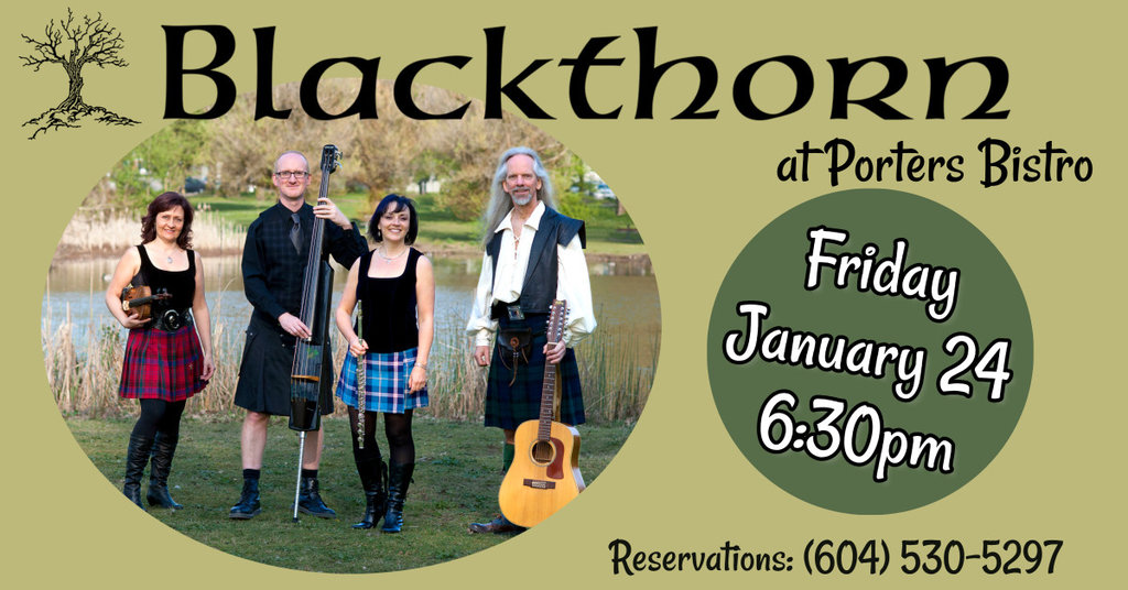 Robbie Burns Day rolls around this time of year - come and celebrate with us! An evening of authentic Celtic music from Blackthorn and food straight from the Porters kitchen. Fully licensed, reservations are required: call (604) 530-5297