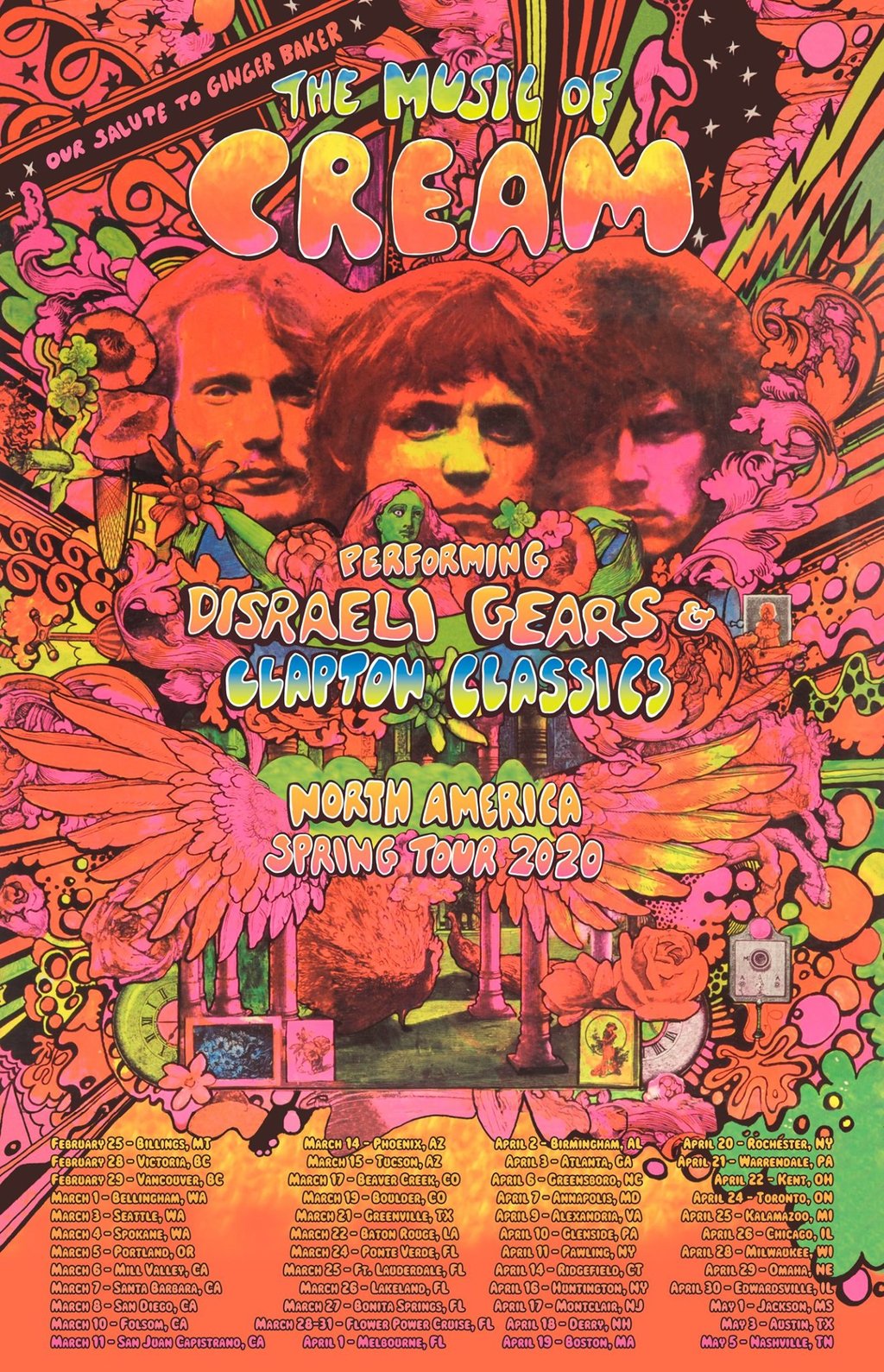 For 2020 and beyond, The Music Of Cream will hit the road with a new show and lineup. Honoring the original band’s landmark 1967 recording of Disraeli Gears, often considered Cream’s crowning achievement, concerts will feature the album performed in its entirety, followed by ‘Clapton Classics’ including hits like “Cocaine,” “Layla” “Crossroads,” and “Wonderful Tonight” along with other Cream hits and rarities that fans have been asking for.