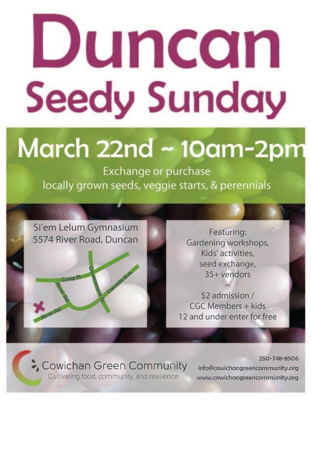 Join us for Duncan's local Seedy Sunday! This event is very well attended by vendors and garden enthusiasts every year. We will have our own locally grown and adapted seeds and there will be many other booths including flower and vegetable seeds, plant starts, fruit bee homes, and more. There will be workshops and demonstrations along with the very knowledgeable master gardeners to answer all of your questions.