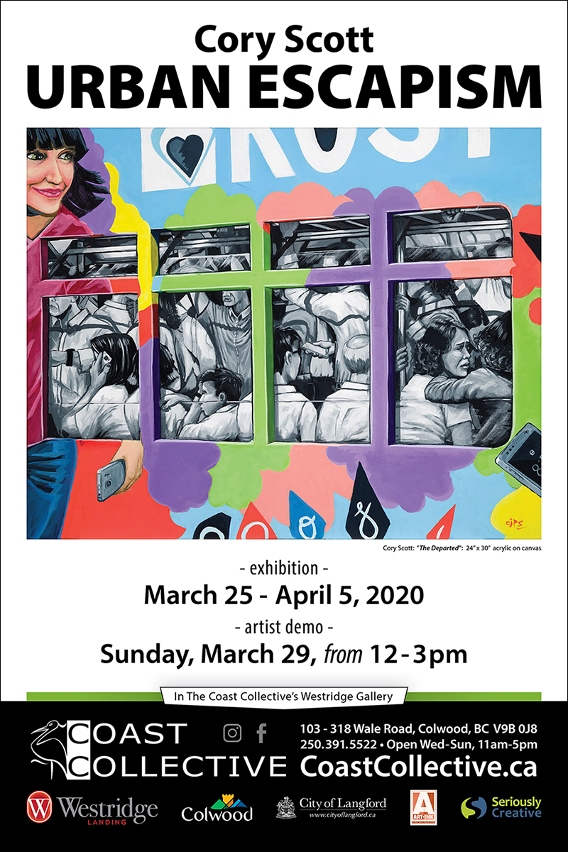 This show features the latest artwork of Cory Scott, a local artist who uses layers of colourful brush strokes, dynamic perspectives, and dramatic imagery to re-shape the urban world in which we live.