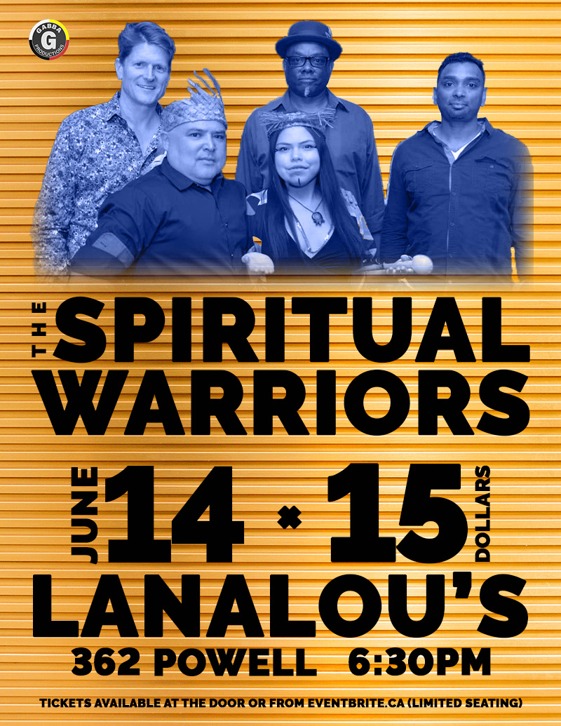 The Spiritual Warriors, create music inspired by the land and life in the coast mountains of the Lilwat Nation. Their unique sound blends indigenous chants with contemporary roots, rock, and reggae rhythms. The uplifting beat underscores the beautiful harmonizing of the vocals sung in English and U'cwalmicwts, the Lil'wat Language. The Spiritual Warriors are led by father and daughter, Leroy Joe (vocals, guitar), and Daisy Joe (vocals) and are accompanied by Richard Doucet (djembe drum). The backbone of the Caribbean rhythm section is laid down by Mike Rowe (bass) and Tim Lall (drums) of Jamaican and Trinidadian heritage. Ancestors, their debut album was released in 2019 and won Best World Recording at the Native American Music Awards in New York. This truly unique band will take you on a cultural journey to the natural heartbeat of the Indigenous drum and the St'at'imc people.