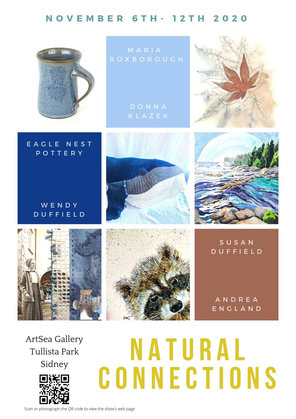 'Natural Connections' includes mixed media art by Wendy Duffield, watercolours by Andrea England, soft sculpture by Maria Roxborough, books and textiles by Susan Duffield, jewellery and wall art by Donna Klazek and ceramics by Eagle Nest Pottery.
