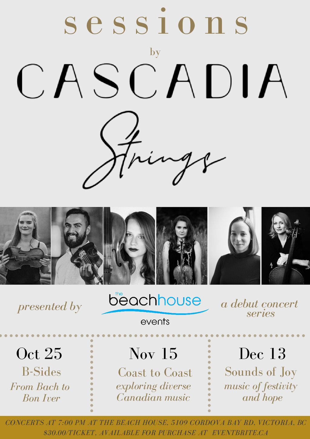 Victoria's newest professional and versatile string collective, Cascadia Strings (formerly Cascadia Quartet & ensembles) is launching their re-brand and first season through a series of three concerts in partnership with The Beach House Restaurant. To open this series on October 25th, a plethora of music from many eras of composition is explored. The common thread weaved throughout the program is simple: the shared initial of the letter "B" by the composers and artists showcased.