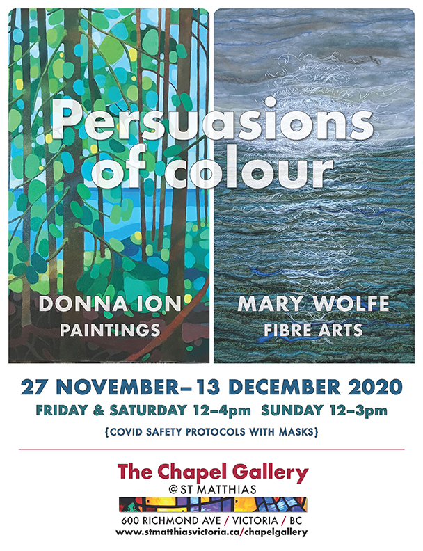 'Persuasions of Colour': Donna Ion, contemporary Oil/acrylic paintings, Mary Wolfe, Fiber art installations @ The Chapel Gallery Nov 27 2020 - Nov 25th @ The Chapel Gallery