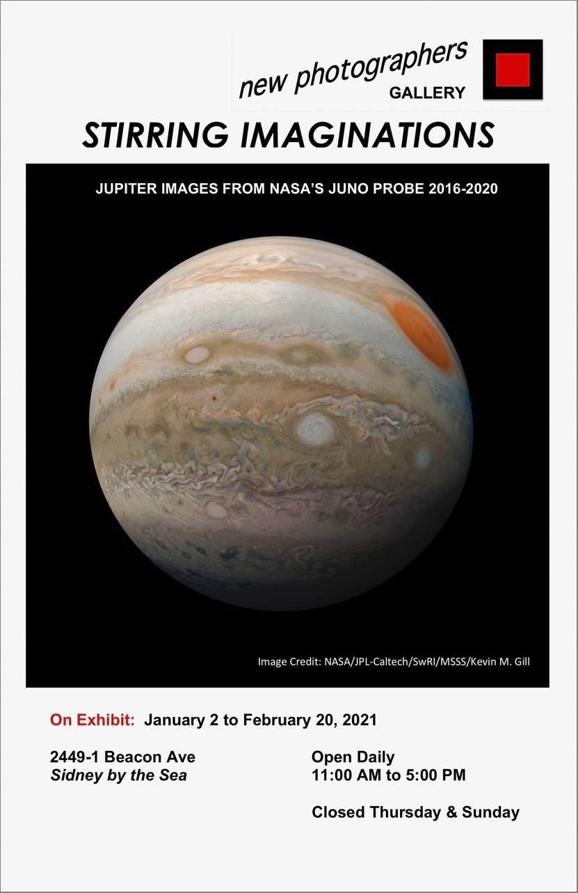 The new photographers GALLERY is pleased to present the exhibit entitled “Stirring Imaginations” featuring several stunning images of Jupiter’s complex hydrogen and helium cloud systems. The images were processed by a number of citizen scientists using data from the JunoCam imager and adapted for public viewing by photographer Peter Ramos of Victoria. NASA launched the JUNO spacecraft in 2011 on its Jupiter Mission. It took five years for the spacecraft to reach and begin orbiting the planet.