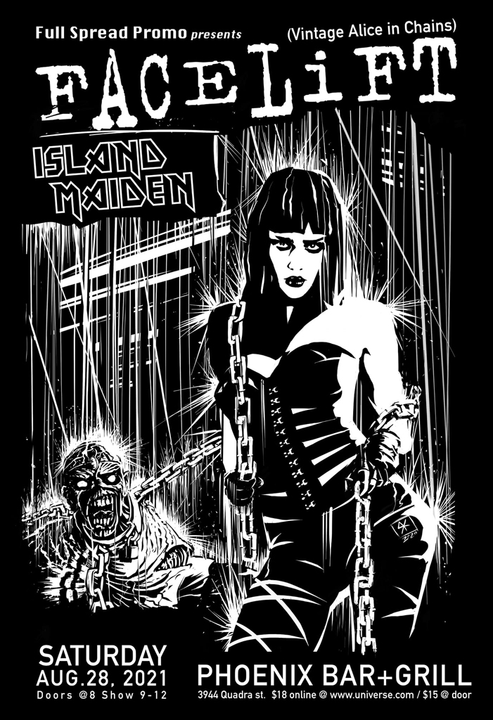 Local music shows are back @ THE PHOENIX BAR & GRILL. Join us as we flashback to a simpler time - when riots, bombings, and the president getting impeached for lying about a blow job - were our only worries. The world has always been messed up - at least now we can tune it out again with some killer music. Join vintage Alice in Chains Facelift and female-fronted Island Maiden rocking old school tunes from the before time. We are only releasing limited pre-sale tickets, get yours now so you don't miss out.