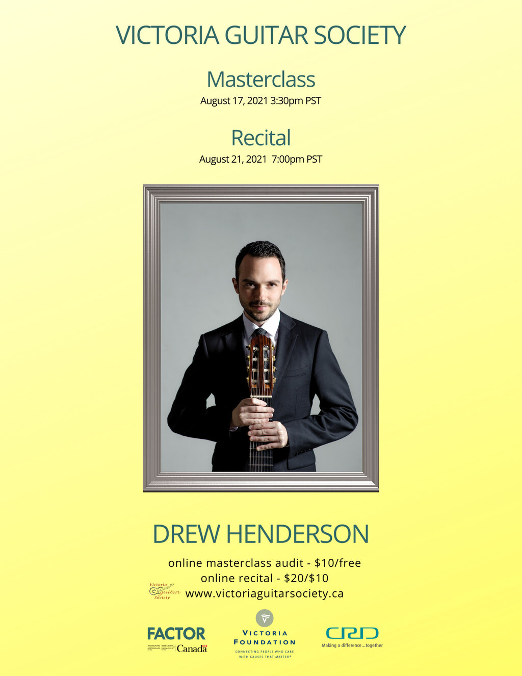 The Victoria Guitar Society is proud to present Drew Henderson in collaboration with the Victoria Conservatory of Music's Summer Intensive Program - Guitar. Drew will adjudicate a Masterclass at the beginning of the week and present a Recital to close the week of classical guitar studies.