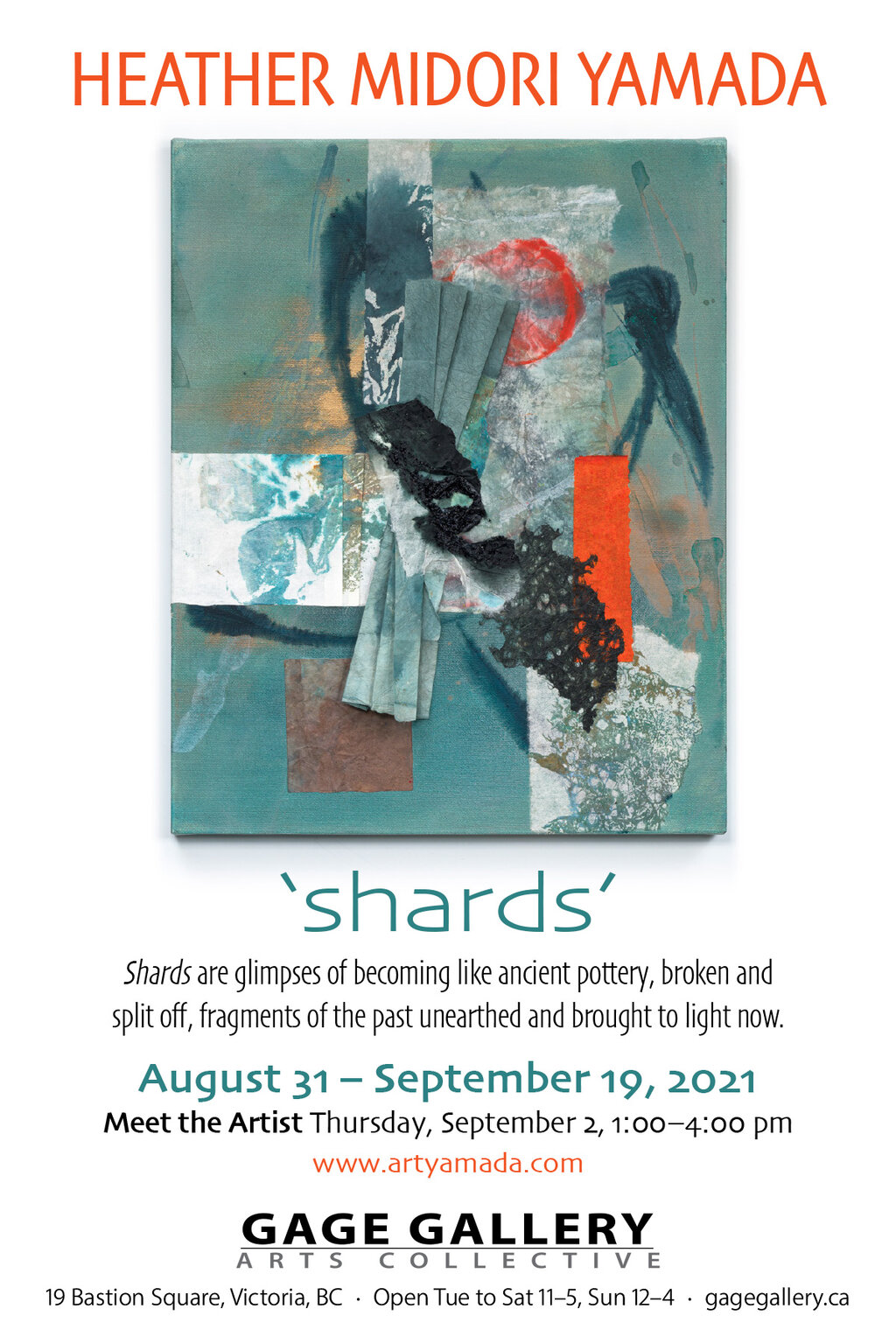 Exhibition of new work by Heather Midori Yamada. Shards are glimpses of becoming like ancient pottery, broken and splito off, fragments of the past unearthed and brought to light now.