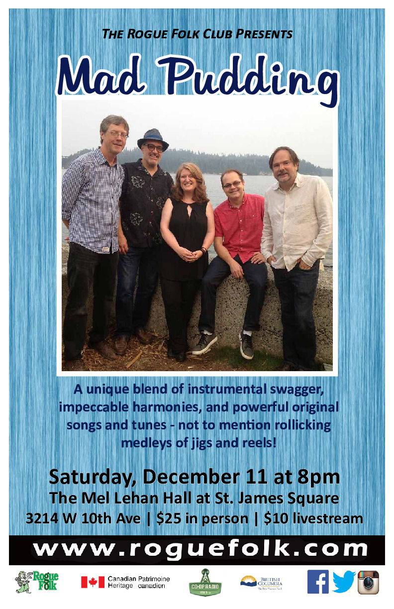 Vancouver’s Celtic-Funk combo Mad Pudding has performed over a dozen times at The Rogue. Their unique blend of instrumental swagger, impeccable harmonies, and powerful original songs and tunes have delighted audiences for over 30 years. The best-loved and most enduring line-up of the band reunites on rare occasions. This is one of those occasions!