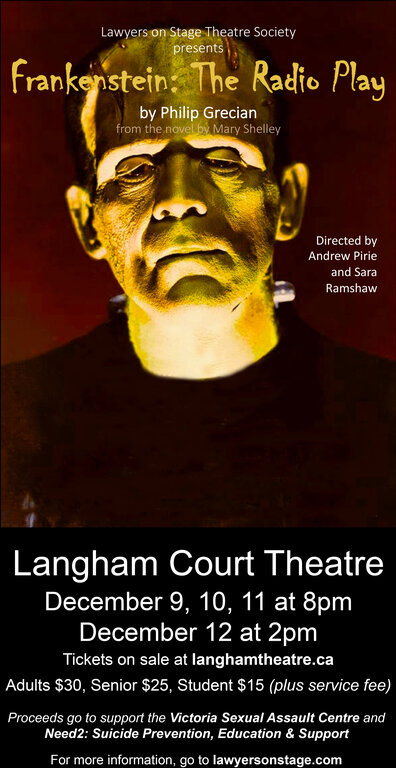 Frankenstein: The Radio Play by Philip Grecian, adapted from the novel by Mary Shelley, Frankenstein, or The Modern Prometheus. Published in 1818, Shelley’s Frankenstein is more than an iconic gothic horror story. It has stood the test of time with messages that still resonate clearly today about ethics in science, feminism and patriarchy, and intolerance and discrimination towards “others” who are different. Who is the “monster?” Proceeds support the Victoria Sexual Assault Centre and Need2, suicide prevention, education, and support.