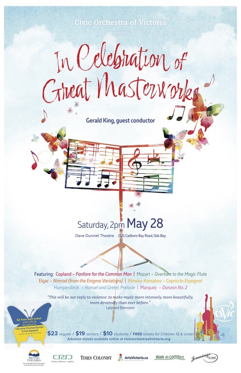The Civic Orchestra of Victoria presents a Celebration of Great Masterworks - featuring time-honoured orchestral works from composers across the globe. The Orchestra welcomes guest conductor, Dr. Gerald King, to the podium for this program. Dr. King is internationally recognized as one of Canada's most respected conductors, adjudicators, educators and keynote speakers, and the Orchestra is delighted to be making music under his direction.