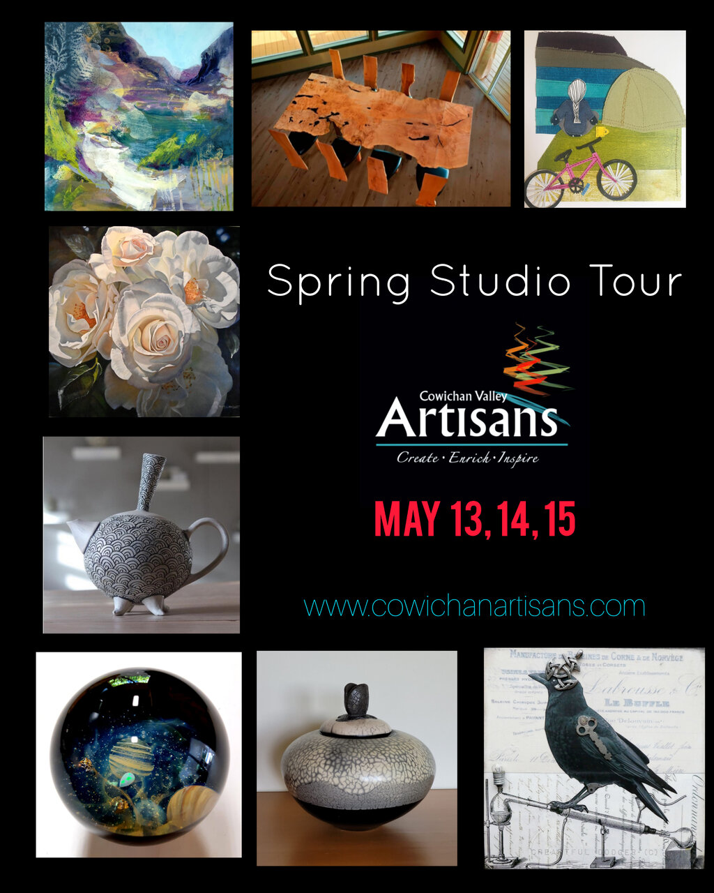 Cowichan Artisan Spring Tour and Sale May 13, 14, 15 10 am to 5 pm. Come and visit some of the loveliest spots in the valley while touring our creative spaces. We are 13 professional artists working to a high standard. Come peek behind the scenes and see what we do. Free event, enjoyable for all ages.