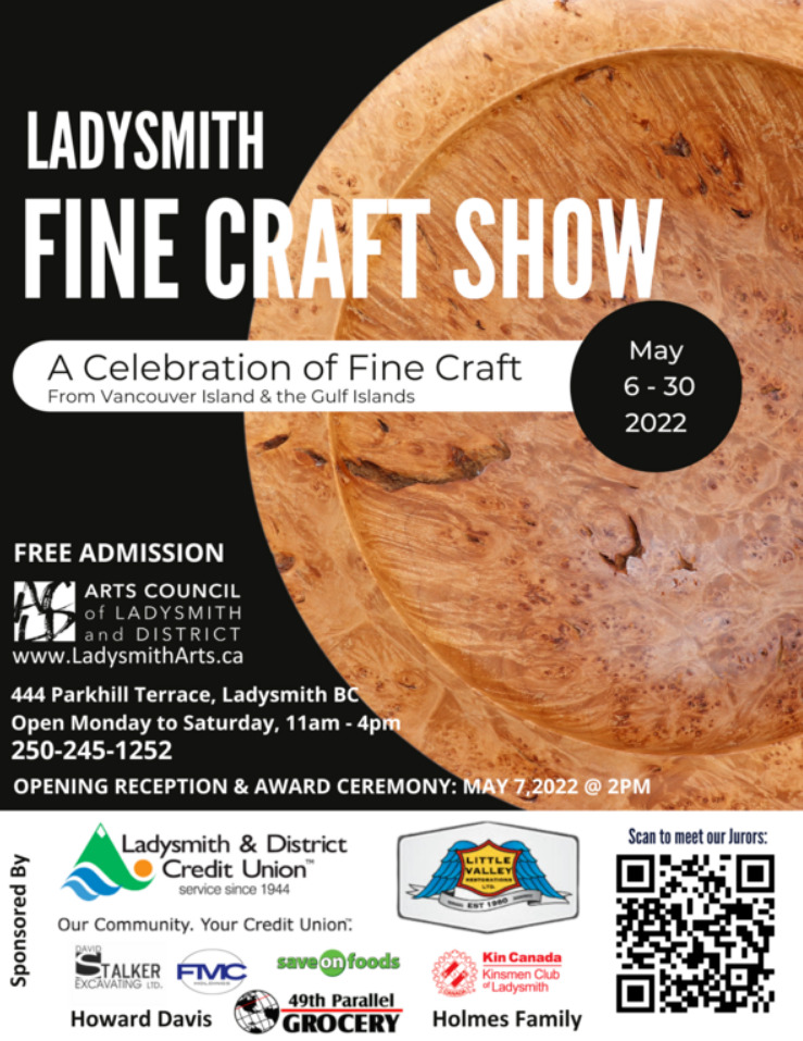 The Ladysmith Fine Craft show celebrates fine craft from artisans living and working on Vancouver Island and the Gulf Islands. The juried exhibition shows the mastery and creativity in a variety of work including basketry, clay, fiber, glass, leather, metal, paper, stone, wood, combined media and jewelry. This special exhibition runs from May 6 - 30, 2022 and is free to view Monday to Saturday 11am to 4pm. Join us at the opening and award ceremony on Saturday May 7 at 2pm and meet the artists as well as awarding $3500 in prizes!