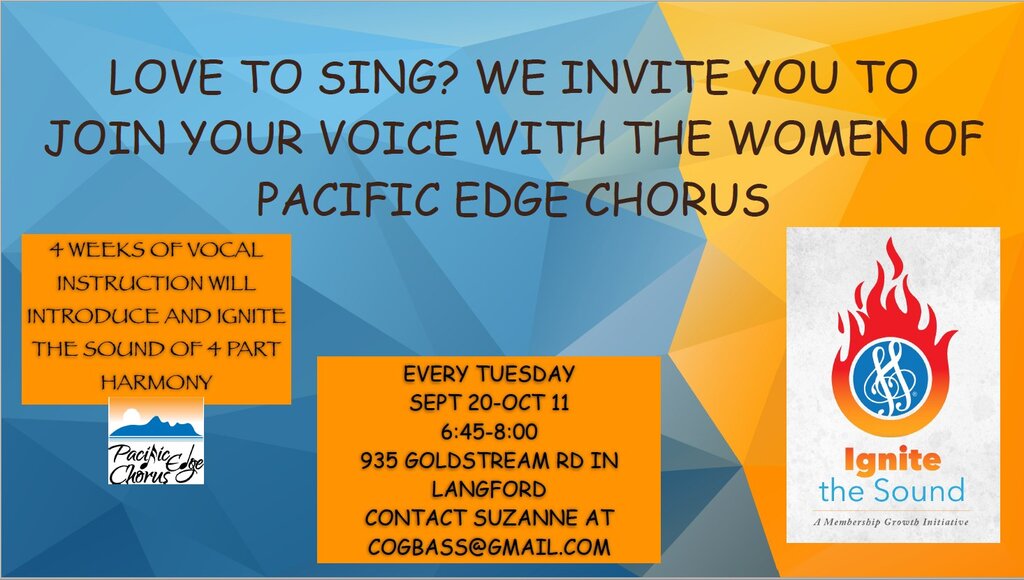 Hosted by Pacific Edge Chorus, instruction takes place 6:45-8:00 p.m. Tuesday evenings, Sept. 20 to Oct. 11 at Gordon United Church hall, 935 Goldstream Ave. (near Jacklin Road), Langford.