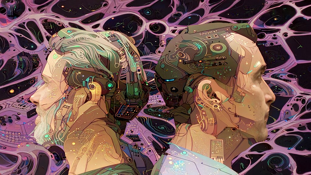 The album artwork and press photos were created using a myriad of AI technology, Image Synthesis and OpenAI's DALL·E, which can be seen in action here. Expanding on the same theme using AI/AR mechanisms, these will be followed by videos and a graphic novel, building into a whole Falorxian planet.'