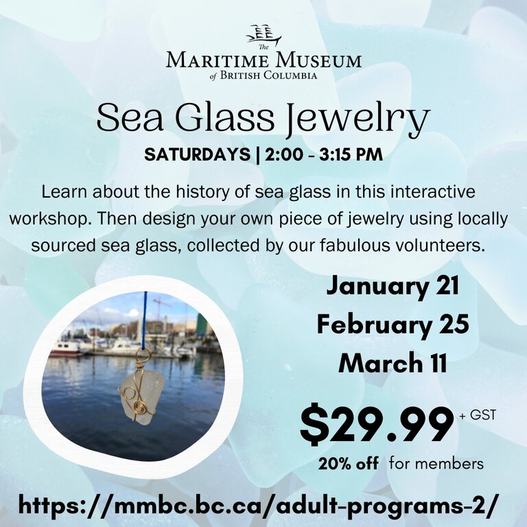 Using locally sourced sea glass, create your own necklace, bracelet, earrings, or other one-of a kind jewelry. Enjoy casual conversation as you learn about why sea glass exists, share local maritime stories, explore the complex relationships we have with the land, and brainstorm how we can keep our maritime habitats healthy.