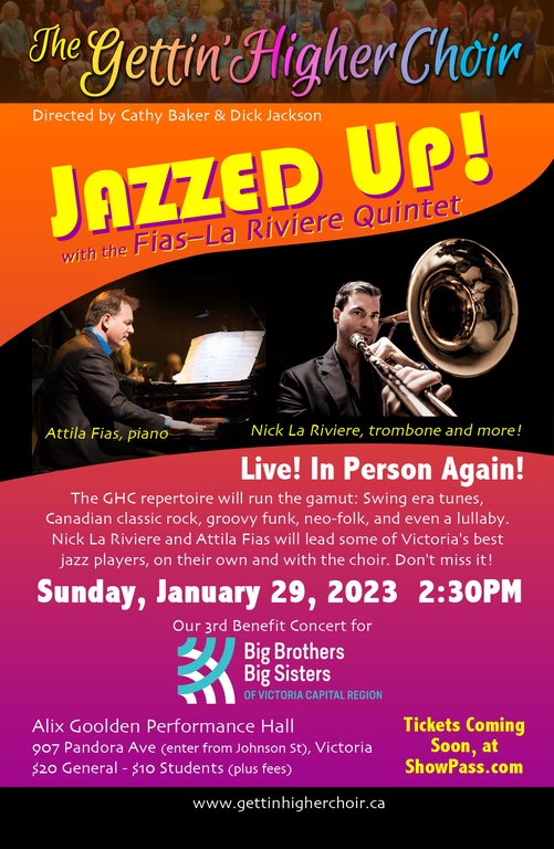 The concert will be a benefit for Big Brothers Big Sisters of Victoria Capital Region (BBBSV) to raise funds for their youth mentoring programs. Proceeds from ticket sales will be donated to help BBBSV expand their programs to address the critical need from local children and their families for the support of volunteer mentors.