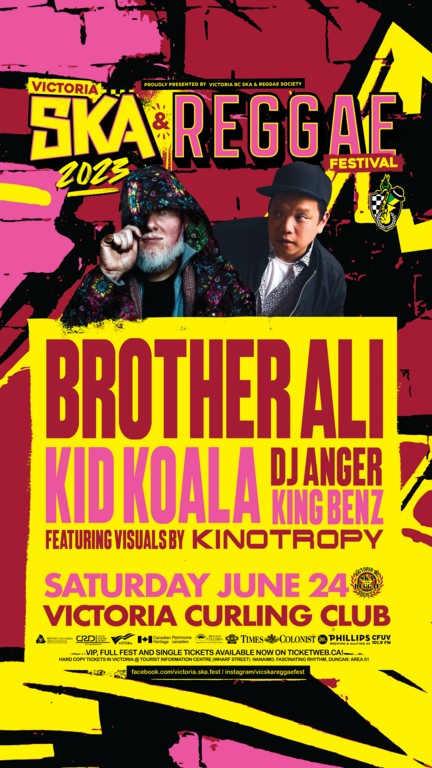 Also taking the Victoria Ska & Reggae Fest stage for the first time is Canada's most-beloved DJs and musical innovators, KID KOALA.. In the vast world of scratching, there are few scratchers who use turntables like an instrument the way Kid Koala does. His sets traverse genres and perform a delicate balance of pleasingly familiar music and thrillingly new ideas and deliveries. His precise, lightning-fast cuts combined with his endlessly creative musical mind, have made him an endearing legend, bringing fans of all musical genres together and showing them how it all fits together even if it seems like it might not. Getting things going and keep the proceedings hot between Ali and Koala is the power duo DJ ANGER + KING BENZ. Their big, energetic mix of electronic beats and hard-hitting rap hit the Curling Club in a big way during last year's festival and we knew we had to bring 'em back for another go. The night will also features from visuals from the uber-talented VJ Kinotropy, to delight your eyes as well as your ears.